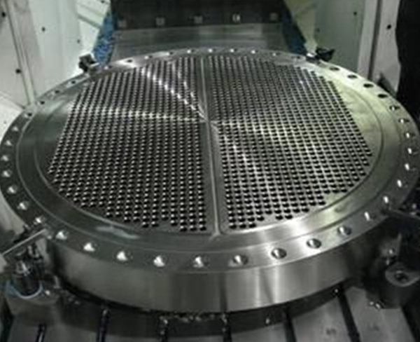 管板加工的精度,特别是管孔间距和管径公差、垂直度、光洁度都极大地影响着以上所列化工设备的组装和使用性能。随着化工设备、电站的大型化,其管板直径也变得越来越大,直径为4m-5m的管板很常见。大型管板的特点是管孔数量多、密、孔径小、深、精度和光洁度要求高。